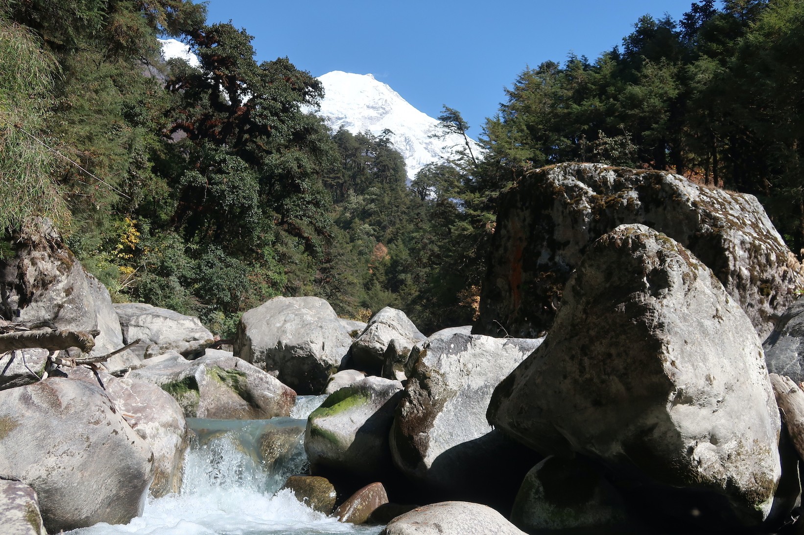 Moving higher, the path climbs through oak and pine mixed with even more rhododendrons on the way to Lama Hotel (2,470m). Waterfalls tumble down through the greenery, and the bamboo stretches over the trail, offering cool shade and shelter for all sorts of wildlife. You don’t just walk through these forests—you’re right in the middle of everything: vibrant plants, rushing water, birds darting through the leaves.