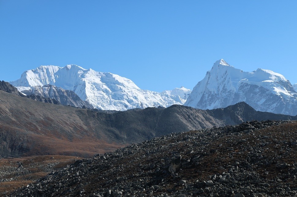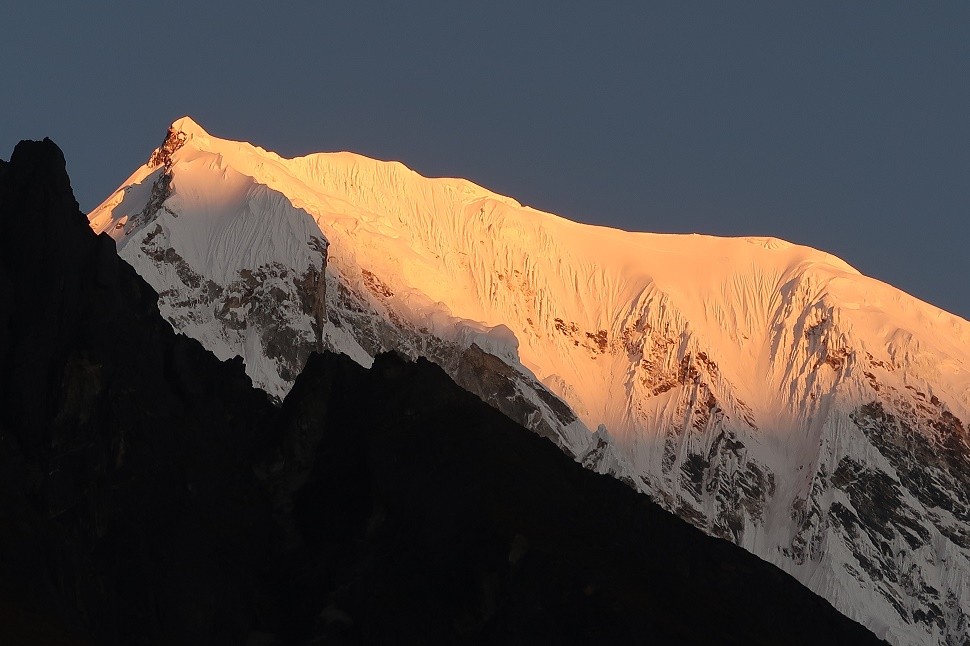 From vantage points such as near Kyanjin Gompa (≈ 3,870 m) or the viewpoint of Kyanjin Ri (4,773 m), you may also spot Yala Peak (5,520 m) off to the northwest. Although smaller in height, the snow-lined flanks of Yala Peak catch the morning glow beautifully and provide a dramatic foreground to the larger massif beyond.
