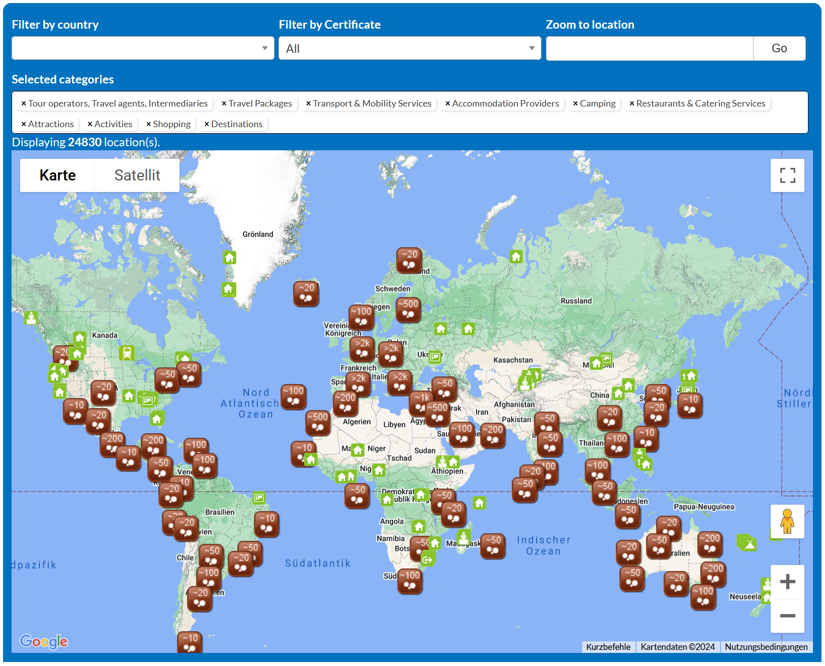 Many "green", "responsible", "sustainable", "ecological" information, marketing and booking services are committed to raise the market share of sustainable and responsible tourism. The Tourism2030 Market Place provides transparency and gives you access to about 100 certification programs on the Global Certification Quickfinder and to more than 20,000 certified businesses, destinations and tour operators on the global Travel Green Planet Maps -  all linked to their certificate's profile. The independent Travel Green Maps are used by Marketing and Booking Services